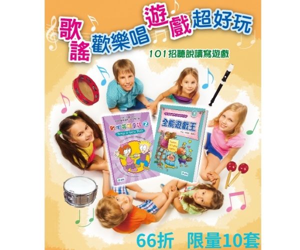 近年來風靡台灣的桌遊,讓我們更加確信,千萬別小看遊戲對於大孩子或成人的魅力!人人都有童心,喜歡追求一點刺激、一點獲勝的快感,所以「遊戲」在英語教學活動中,一直佔有相當重要的地位。小小孩需要它帶動學習動機,大小孩喜歡它作為學習活動的調劑。課堂中需要活動的時候,您就會需要《全能遊戲王》這本蒐羅 101 個英語課堂遊戲的好用工具書啦!而另一套要介紹的《歡唱英語童謠》 CD,則收錄了 4-8 歲美國小孩最愛的英語童謠,讓小小孩能經由律動與音韻,自然而然地學到許多句型與文化。