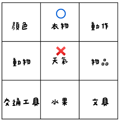 Step 1. 老師先在紙上畫出九宮格,並在每個格子寫上不同的主題,例如:動物、天氣、顏色、交通工具、水果等。