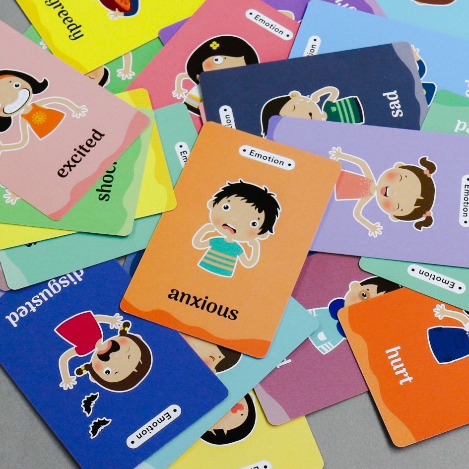 2. 從情緒海報中挑選單字(如:happy, nervous, proud, frustrated…),每個單字做兩張小卡。(可依照班級人數作彈性調整)