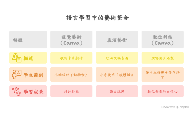 心戲,完全沉浸在語言學習中。 - 數位科技應用:透過 Canva 錄製演唱影片,讓學生在真實情境中使用語言,同時培養數位素