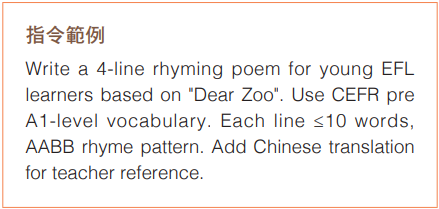 「我又不是詩人,如何寫出好的教學韻文?」這是許多老師的心聲。好消息是,ChatGPT 就可以解決這個問題。讓我用《Dear Zoo》來示範:
