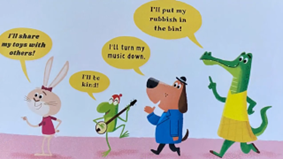 - Group Presentation 小組發表:讀完繪本後,請各組學生討論:How to be a great neighbor?,請學生列出重點,老師提供句型架構:I will put my rubbish / trash in the bin / trash can.、I will not play the piano after 9 p.m. 以及示範發表,讓小組發表有模式可循。各組學生發表完,可以分享一下繪本最後每個動物的心得!