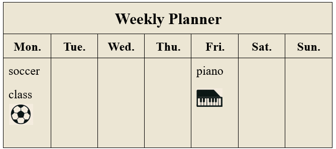 在學完時間介系詞之後,請學生製作 My Weekly Planner,並使用所學句型(如 I have soccer class on Monday.、I play the piano on Friday.)寫出自己的行程,並畫上插圖。最後全班進行互動分享,幫助學生學習如何表達。