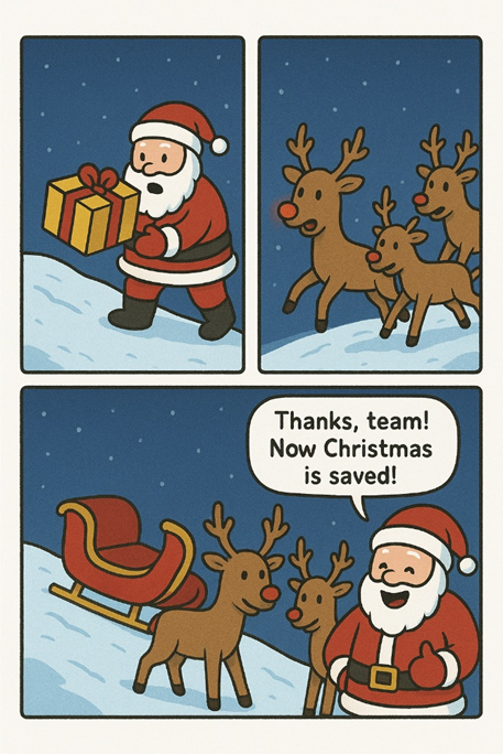 Santa Claus laughs and says, “Thanks, team! Now Christmas is saved!”