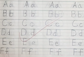 字母的書寫要明確指導書寫格式,寫的時候要頂天立地,位置寫正確,還要邊寫邊說出字母名稱和字母發音,而不是數筆畫。透過 Say and Write 的方式,紮實建構字母與字母發音的對應關係。這是很重要的單字拼寫基礎。已經學過的字母,每次都要讓學生累進式練習 Say and Write,這樣就能在書寫時建構字母與發音之間的穩固連結,大小寫也能正確配對。參考指導語如下:Please say and write the letters from Aa to Ff.。