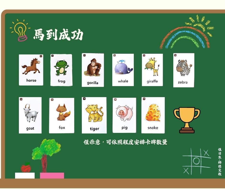 Step 1. 學生分成兩隊,由敵隊將動物字卡貼在黑板上,但第一張必須從 “horse” 開始,並在終點放上獎盃的圖卡。