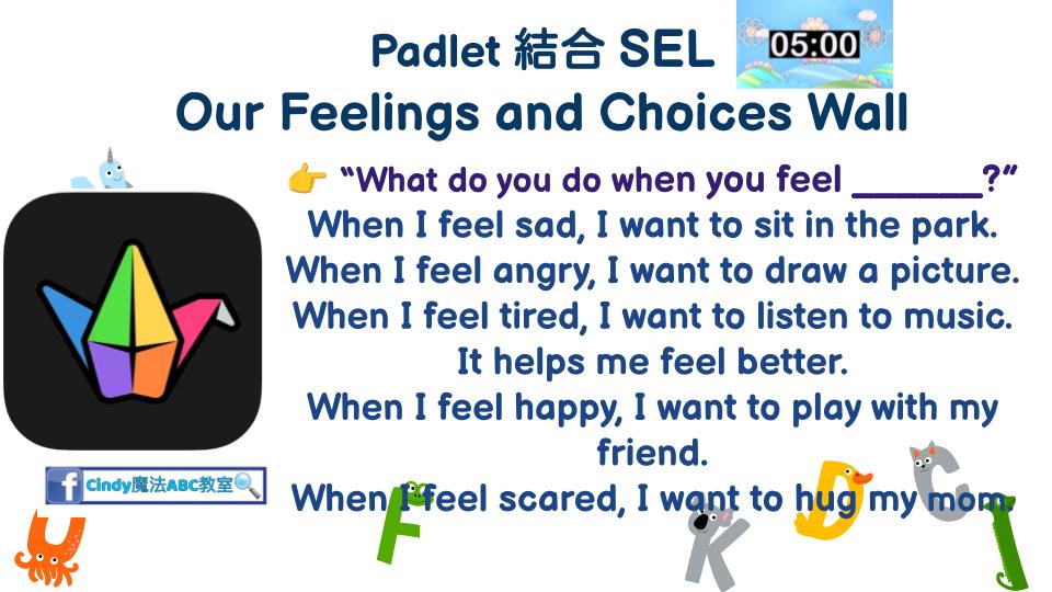 - Padlet AI 從文字看見想像的力量:在 Our Feelings and Choices Wall 活動中,我協助搭建語言鷹架,請學生在 Padlet 輸入自己的心聲:When I feel sad, I want to sit in the park.,AI 會根據文字生成圖片,看著文字變成圖像,孩子的成就感溢於言表,也更樂於進行成果分享。
