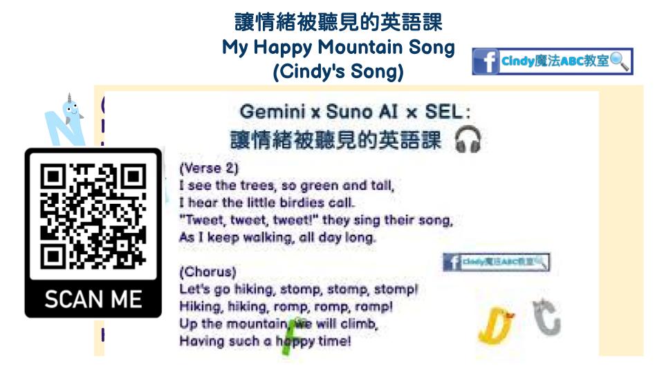 - Suno AI 唱出表達情緒的英語課:音樂能幫助記憶與發音,讓學生感受語調與重音。我把學生在 Padlet 寫出的句子,利用 Suno AI 生成一首帶有封面與歌詞的客製化歌曲。當孩子跟著唱跳出:Hiking, hiking, romp, romp, romp! Up the mountain, we will climb!,那種多模態的沉浸感,讓全英語教學充滿了旋律與笑聲。