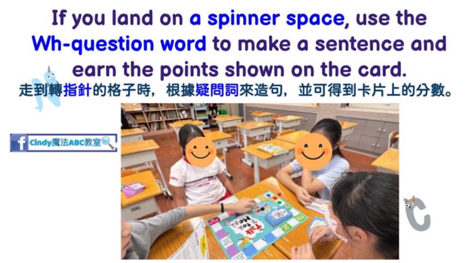 - 深度互動的《Talk to Me 桌遊板》:當教學進入功能性句型(如:How often do you…?、 What do you…?)時,我會帶入桌遊。學生兩人一組,轉動轉針 (spinner),並根據疑問詞 (wh-questions) 來造句得分,在過程中,我落實了差異化教學 (Differentiated Instruction)。