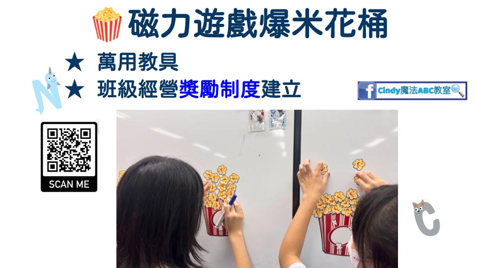 - 班級經營的動態回饋:在我的教室白板上,貼著幾個可擦寫的《磁力遊戲爆米花桶》,這也是很多老師喜歡、簡單卻強大的獎勵制度。只要小組願意嘗試提問、回答或是發言音量適當,該組就能獲得一顆磁力爆米花,我常說:Say the word loudly! 或 Your team did a great job!,這種小工具營造出Speak with Support 的正向氛圍,讓說英文變成為團隊爭取勝利的光榮感。