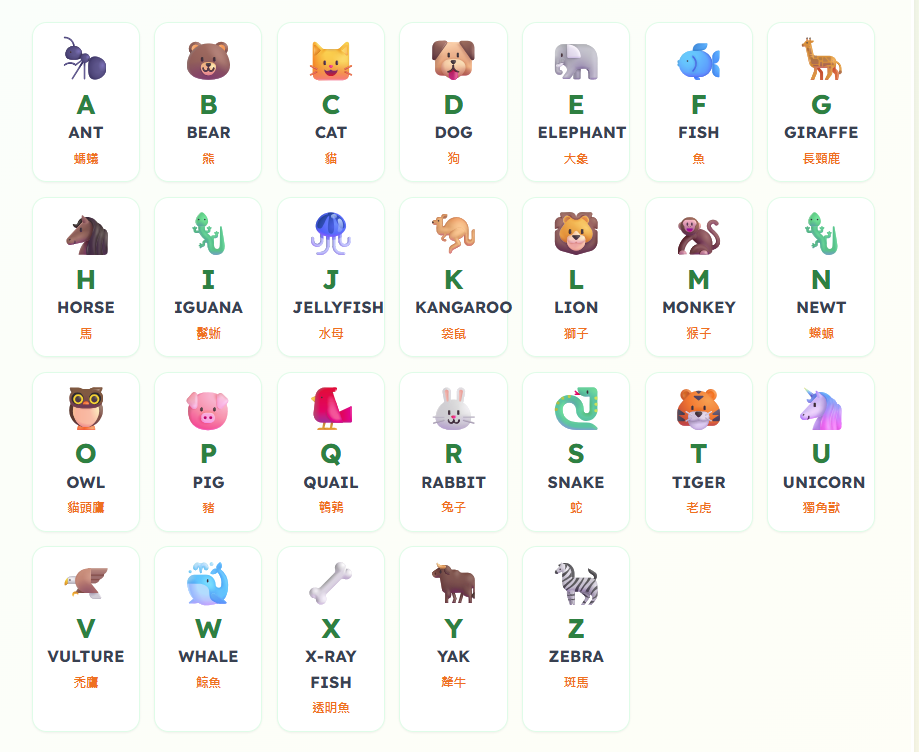 網頁第一頁要包含 26 個單字(圖片加英文)在內。