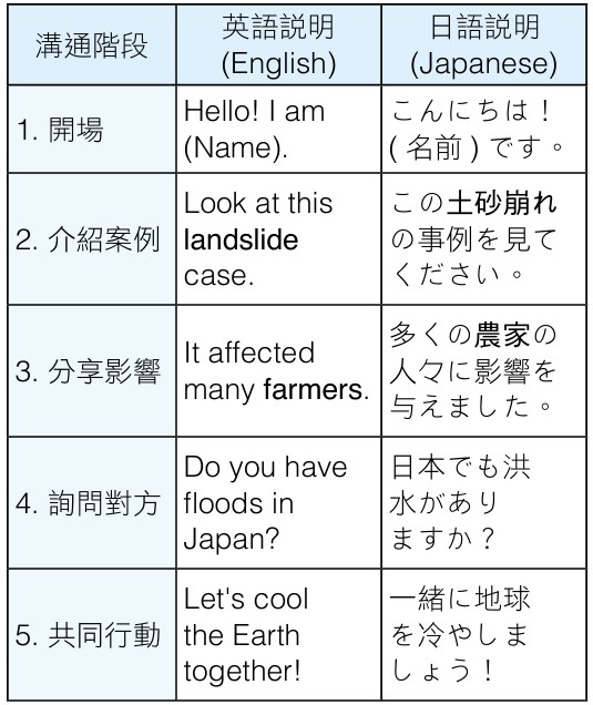 針對五年級學生的語言程度,團隊設計三語(英、中、日)對照的句型卡,協助學生自信地與日本同儕進行專業交流。透過這些句型,學生能流暢地分享台灣在土石流與防減災方面的經驗,並詢問日本夥伴對極端天氣的應對方法。
